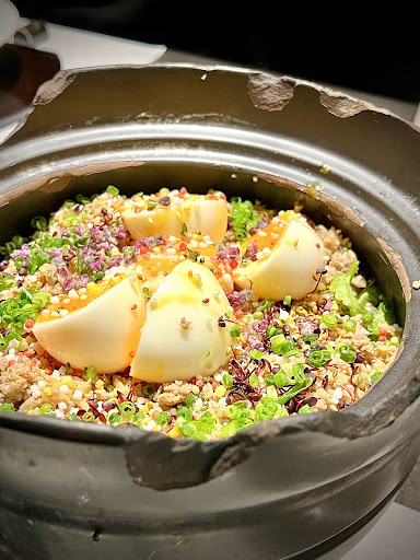 ここの特徴はなんといっても"独創性溢れる美味しい創作和食"ではないでしょうか。 先付けのチーズ豆腐の最中からすでに面白い。 凌ぎで出されたのはまさかのバーガー。和食でバーガー!?と驚きましたが、お店で焼き上げたパンを使用したフィレオフィッシュバーガー、かなり美味しい。和を感じるバーガーでした。 締めの土鍋ご飯が選べるのも嬉しい。私は鴨そぼろと半熟卵と芹の土鍋ご飯にしましたが、余った分はおにぎりにしてもらえる嬉しい! 程よい高級感もありつつ、肩肘張らずに楽しめる空間で、友人たちと楽しいひと時を過ごせました。