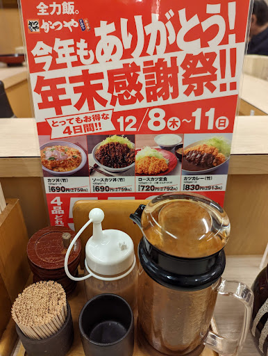 Read more2025年8月15日金曜日の晩ご飯で利用 感謝祭最終日に入店直ぐに券売機が👀暫く来なかった為、時代の流れかと思い操作 店内飲食とテイクアウトを同時オーダーしようとしたが、分からず個別にオーダーし会計処理 オーダーしたのはロースかつ定食 個人的に1番安定したメニュー次にカツカレーに唐揚げも旨いのでお気に入り🔖 いつも通り値上げされたとは言え見た目維持されております。 着席したのはカウンター 椅子が固定式だから、ちょっと荷物が有ると座り辛いのと、場所によって窮屈なんだよね。 冷茶等卓上に有れば利用しやすいけどスタッフさんが配給するタイプだからいちいち声掛けしなけりゃならないのは不便だしスタッフも大変だと思う また卓上アイテムの辛子とか、沢庵等の補充が間に合って無かったりで、相変わらず確認不足なのは変わらず。 感謝祭は鉄火場でスタッフさんは大忙し 券売機を導入して、さぞかし他の業務をこなせるかと思うが、年配の方は操作に戸惑い 発券した後は空いた席に自分で取りに行くスタイルなので、ちょっと分かりづらい。他の方も口コミされているけど、発券された商品が作られてしまうのではないか?とかスタッフ〜の声掛けも無いので不安😨でしかない。 取り敢えず頂きます。いつも通りだけどトンカツのカットが均一ではなく素人さん 厚い所と薄い所がある始末 肝心の豚汁のヌルい事と味噌󠄀が薄く豚🐷肉ケチりすぎて、豚汁風味の薄い味噌󠄀汁はガッカリする 最後に食べ終えてご馳走様と声掛けしたが、挨拶もされず、スタッフ4〜5人いて反応出来ない男性スタッフさん ちょっと配慮がなさ過ぎて不満でしか無い。個人的に感謝祭は忙しいけれど以前は活気が合って挨拶もしっかり出来て良いお店だと重宝していたけど残念😞デス。 2024年5月 晩ごはんで飲食 フル盛りプレートフェアに定番のロースカツと唐揚げの合盛定食をオーダー 今日は見た目満足キャベツが高値なのに盛りが良い 追加トッピングしてもいないのに、唯一豚汁の味噌の加減はちょっと薄く感じたのが残念😑男性スタッフさんの接客が気持ちが良い👍やっぱり揚げたてを直ぐに食べれるのは有り難い。後片付けも揚げ物は大変だし。美味しく頂きました🥰ご馳走様でした。 2022年12月9.10金、土曜日の晩ご飯で利用🥰安定してお得🉐に頂けて満足🍛ご馳走様でした😋2022年1月29日土曜日 限定メニューのトンカツ豚焼き肉スタミナ焼き定食をオーダー 限定メニューのポスターに引かれてオーダーしたものの焼き肉タレが大量に使用されていて、しょっぱくて年配者には、食べきれず😑限定メニューは、目👀を引かれるインパクトも大事だと思いますが、やり過ぎは、客を遠ざけてしまいます。もっと丁寧に作り込んでメニュー開発を、お願いしたいデスネ。今回の限定メニューはハズレでオススメ出来ない😅メニューでした。ターゲットは肉体労働者が食べる為の食事 次回の限定メニューに期待したいと思いました😔 手軽に熱々の豚カツが食べられる良いお店です。各テーブルにある、割り干し大根(漬物)が無料で甘じょっぱく歯触りポリポリで、ご飯がススムくん麦茶でもポリポリ。お会計時には、必ず期間限定100円引きクーポンが頂けて、次回以降お得に頂けます。また期間限定メニュー かつやオリジナルメニューなんかもあり、こちらもなにかと話題 過去にぶっ飛んだメニューも開発 また期間限定で150円引き限定メニューも8月9日から始まるので、お得に美味しく、頂けるのは、嬉しいですね。 8月25日日曜日限定メニューの唐揚げタレのチキンカツ定食大盛りを、注文 見た目のインパクトは十分 さてお味は、甘じょっぱい濃い目のタレ(めんつゆ、分かり易く例えると)に生姜が効いて、ご飯がススムクン...