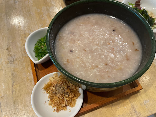 Read moreおすすめは1番人気のトムヤムクン粥!エスニック感がたまらない! 店名の通り、外苑前にあるお粥や麺の専門店です。カウンター・テーブル・ソファ席などがあり、思っていたよりアットホームな雰囲気。私含め、1人客も多く、男性女性比率は半々くらい。平日12時頃に伺いましたが、既に店内半分くらい埋まり、12時半あたりには待ち客が出る人気店です。 ランチメニューはお粥10種と麺系7種、数量限定のチキンライス。どのメニューにもプラス220円でセルフサービスおかわり自由のサラダ・ドリンクを付けることが出来ます。 迷いなく、私はお目当ての1番人気・トムヤムクン粥(1,030円)に味玉追加(120円)を頂きました。 木製のお盆に乗せられたお粥にはフライドオニオン、胡麻、粗びきこしょう、パクチーがトッピングされ、中の具材として中くらいの海老が5尾くらい。追加の味玉は紅孔雀という卵で、赤色が強めな濃厚な黄身が特徴。中は半熟どころか温玉くらいのとろっとろで優しい味付け。 お粥は五分粥ということで、ゆるめかと思いきや、米に加えて大麦入りで、米のプチプチ食感も程よく残りつつ、ねっとりトロトロ食感。トムヤムクンのあの絶妙な酸っぱ辛い味が本当にやみつきになる美味しさ。辛さは結構しっかり目で、後半はじんわり汗をかくほど。笑 辛さが苦手な方はチーズなどを追加すると良いかもしれません。味変で卓上に置かれているナンプラー(魚醤)を入れると、さらにエスニック感が増すのでおすすめ。黒酢も意外な組合せだなと思いましたが、味がマイルドになり、コクもプラス。 普通は約500gで、お店の男性の若い従業員の方も小盛350gで足りるとのことだったので、小盛にしましたが、十分に満足な量。他のお粥や麺も気になりますが、このトムヤムクン粥が気に入りすぎて、多分次も同じ注文をする気がします。胃を休めたい方には青菜粥や素の白粥などもあり、無添加なのも嬉しいポイント。次は中国へ行って以来、お粥にハマっている父親を連れて行きたいと思いま...