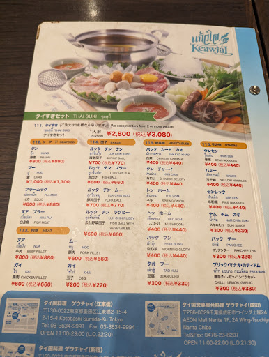 The restaurant is quite simple looking, nothing fancy, just a pretty casual looking restaurant. But I keep coming back as much as I can, when I am in the neighborhood or even sometimes when I am far but when I feel like having GOOd Thai food... I actually wish I was their neighbors). The reason is that the taste of their food is just sooo perfect! Fresh, generous, spicy (carefully, spicy as in Thai spicy, so pick your dish wisely) and beautifully perfumed. My absolute favorite is the papaya salad (which they haved marked with 1 chili pepper but that I would have marked with 2 or 3 chili peppers depending on the day). I haven't been in Thailand very often but it tastes just as good as in my memories. In top of that, the service is really nice (the staff seems to have real smiles on their face, which is quite unusual in Tokyo), they never make any mistake and the prize is really reasonable. We paid 7000 for today's dinner for two people (2 beers, 1 tea and 4 dishes : papaya salad, chicken fried rice, garlic n black pepper shrimps, chicken and peanuts). Just one piece of advice, stick to the non spicy dishes if you can't deal with spicy... but...