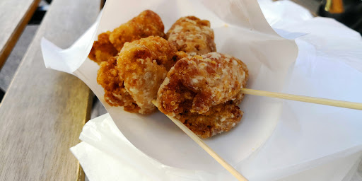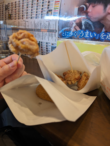 Breaded fried chicken breasts & thighs sold by weight at a small specialist snack bar.