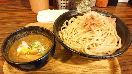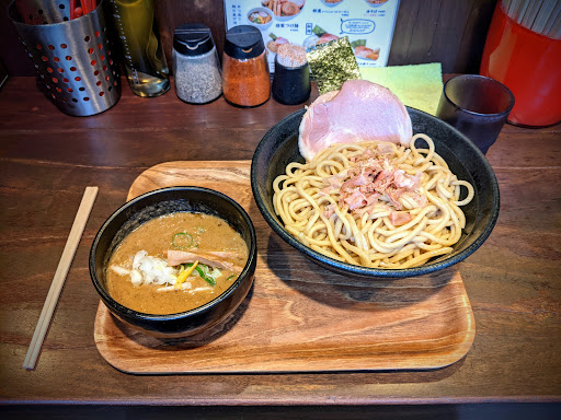 2023年初訪問。連れは前人未到のつけ麺500g+タマネギトッピング、私は期間限定のマー油味噌ラーメン+バター、麺250gを注文。味噌ラーメンは細麺だと思っていたが。中太麺だった。知っていたら180gに抑えていたよ。マー油とニンニクで汗を大量に掻きながら完食。味噌っぽく無い味噌ラーメンは好きだな。でも味噌ラーメンは隠れ唐辛子の巣なので注意が必要。連れは麺500g(茹で後800g)の麺を完食。スゲー!やはり、つけ汁が足りなくなるらしいので、つけ汁を追加注文していた。とてもじゃないが私には喰えん。私は少量頻回の食事が好きなんだ。