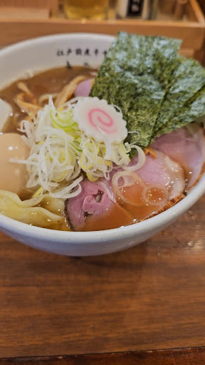 江戸前煮干中華そば(醤油)ですが、スープは上品なのですが、しっかりと、煮干しの甘味や、ややエグミを感じる煮干前回の昔ながらの中華そばという感じです。ほんのりと柚子の香りも良いアクセントですね。麺は、やや高加水の中細縮れ麺という感じですね。麺量も体感180g程度と結構ボリュームもありますね。具材は、チャーシュー2枚、長ネギたっぷり、メンマ、ナルト、海苔という構成でした。