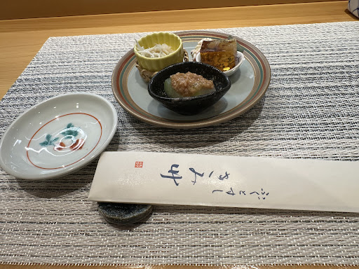 さて、まずはビールと突き出しです この突き出しがもうすでに逸品 ここから、しらうお、焼き牡蠣、鱧の炙り、平目、釣り鰺と続きます 全てが超逸品で、市場へ出向き舌を頼りに仕入れをする大将の確かな味覚が伺えます