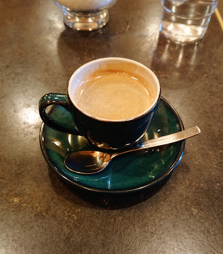 今回はエスプレッソをいただきました。 エスプレッソなのですが抽出量がやや多いルンゴ風の分量で提供されるため、少し濃いデミタスコーヒー程度の感覚でいただけます。 そのためストレートで飲みやすい。 チョコミント風のフレーバーでハーブ感のあるブレンドはブラジルベースでしょうか。 しっかりコーヒーを飲んだ気になる一杯でした。