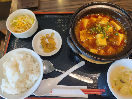 四川風麻婆豆腐というからには辛いのかな?と想像していたのですが、さほど辛くありませんでした。卓上にラー油があったのでかけて食べていましたが、唐辛子など辛味を足せる調味料があればなお良かったのかなと思いました。 時間がたってもアツアツで美味しかったです。 ご飯とスープはおかわり自由で、スープはとても優しい味(薄め)で和風顆粒だしの味がして、そこは薄くても中華であってほしかった。