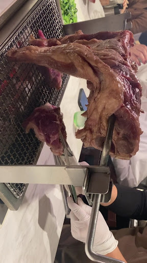 ある程度お肉をハサミで切ったら、お肉は厨房に引っ込んで、食べやすいサイズにカットされ戻ってきます。 ぶっとい大腿骨らしき骨も来るので、骨にかぶりつきたいヒトは焼いて食べてください。 ちなみに兎もありますが、小骨が多くて食べにくく、羊の方がオススメです。