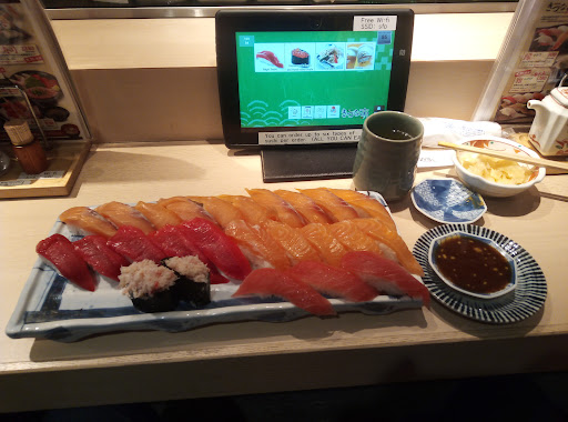 You can order different types of sushi and side dishes (salads,french fries) with the tablet. Maximum is 30 pieces (and 6 types) per a single order. Timelimit is 90 minutes, last order must be placed at 60-minute mark. If you go alone, you will sit at the counter and the chef will hand you the plates with the sushi you ordered. If you go with 2 or more people, you will be appointed to a table.