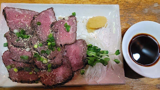 おつまみ牛たたき(800円) すりおろしにんにくをたっぷりのせて濃い口醤油にしっかりつけてパクリ。とにかくパンチがすごいです。お肉も柔らかくて素敵。パンチが強すぎる、と思ったら、添えられたカイワレ大根と一緒に頂くことで、あっさり感を演出してくれます。