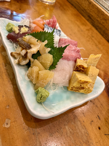 まずは刺身盛り合わせ。 マグロ、サーモン、しめ鯖に白身魚、そして数の子や貝まで…一皿で季節をまるごと味わえるようなラインナップ。どれも切り身が厚く、口に入れると弾むような食感とともに旨みが広がります。特に脂がのったトロと、コリっとした貝の対比が素晴らしい。添えられた卵焼きは優しい甘さで、締めの一口にもぴったり。