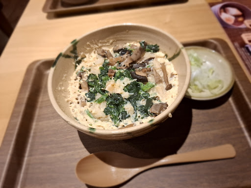 最後に〆のお雑炊を。キノコがたくさん乗っていて、たまごもふわふわ、味はとても優しくさっぱり。締めに最高です。