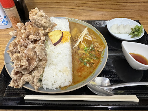 Read more近くで仕事だったので5-6年ぶりにブタカラを食しにことぶき食堂さんへ! 駐車場はないので近くのコインパーキングに。 前を通った時は並びが2名あったんですが到着するとすんなり入れました。 以前伺った時は親父さんがやってたんですが今は娘さん(?)主体で営業されているっぽいです。 確かめてないのであくまで憶測です。 席はカウンター2席とテーブル3-4個なので混雑時は多少待つ恐れありです。 以前来店したときはあったラーメン系のメニューは今はなくなっておりブタカラがメイン。 メニューを見ているとブタカラとスパイスカレープレートというものがあったので迷わず注文。 店内見渡すと前来た時よりサイン増えてる! 男性ブランコがラヴィットで来てたんだーとか見てたらブタカラとスパイスカレープレート到着。 ブタカラにはタレが付いており足りない場合には小皿に入ってるタレをかけるかディップするという感じ。 まず念願のブタカラを食す! カリッと揚げれてるブタカラ美味い! ニンニク醤油につけられていてタレは酸味のあるタレなので食べすすめてもクドさや油っぽさを感じさせない。 スパイスカレーは和風!めっちゃ出汁きいてる!煮干し!?シャバ系で出汁効いていて程よい辛味もあり美味しいです。 そして何よりブタカラと想像より相性がいい! ブタカラとスパイスカレープレートを頼んで正解でした。 5-6年あいたことにより進化を遂げていたことぶき食堂おそるべ...