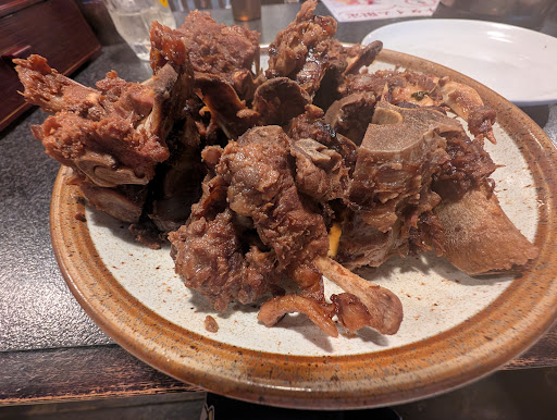 醤大骨は、見た目は豪快だが、八角等のスパイスの香りが心地よく、塩味が効きすぎていない、意外と優しい味で、とてもおいしい。骨の隙間に入り込んでいる肉をこそげ落として食べる料理であり、箸やフォークで食べることは困難。手で食べる必要があるが、そのために使い捨ての手袋をくれる。 水餃子セットの水餃子もとてもおいしい。皮は厚くてモッチリ、餡はキャベツや白菜の入っていない、肉中心で水分少なめのタイプで、しっかりと噛み応えがあり、肉の味がする。海老が入っているのも嬉しい。