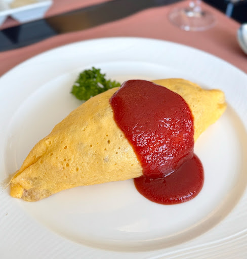 オムライスはハーフサイズを注文。 見た目はまさに王道のケチャップオムライスといったところで、オムレツのきめ細やかさが、美味しさを物語っているかのよう。
