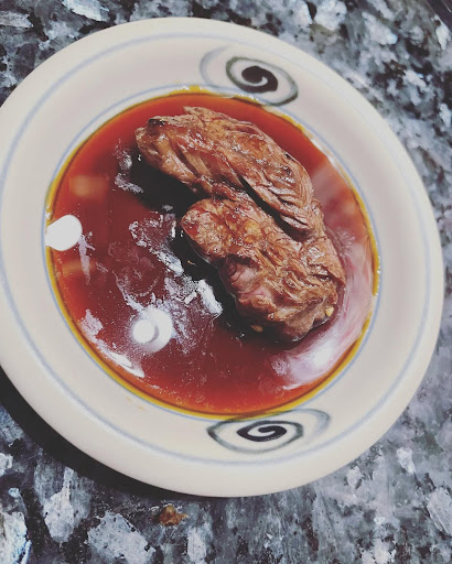 まずはじめにいただいた「ポッサムキムチ」は、見た目も華やかで、まるで宝箱のようでした。白菜の中には、ホタテやタコ、リンゴや松の実などが包まれ、辛さは控えめ。魚介の旨味と果実の甘さが絶妙に調和し、一皿の完成された料理として成立しておりました。