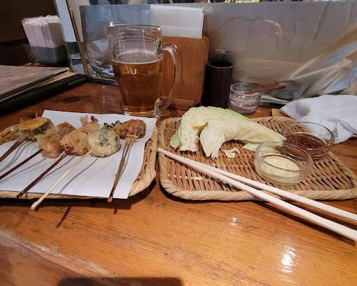 Batter-fried skewers are the focus at this cozy, wood-paneled eatery with counter & table seats.