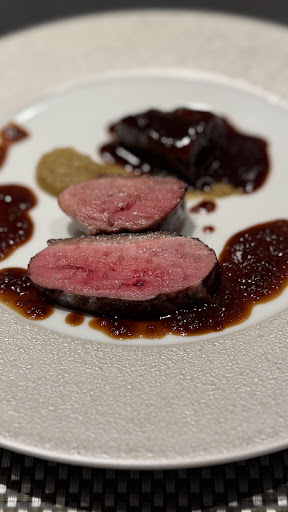 ●岡谷鴨胸肉エシャロットソース 茄子ピューレ 松阪牛赤ワイン煮込み 鴨は柔らかく深い味、茄子ピューレがコクをプラス。松阪牛の赤ワイン煮込みは濃厚で肉の旨みがぎゅっと詰まっています 。