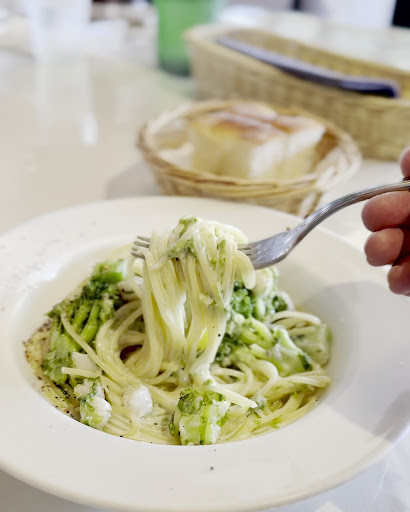 パスタは「小柱・ブロッコリー・青のり クリームソース」を。具がたっぷりで、キュッとした小柱、とろりとした青のり、やや固ゆでのブロッコリーの食感が楽しい。クリームとチーズのソースも味よし、香りよし。