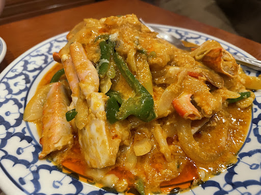 We tried classic Thai dishes such as papaya salad (som tam), stir-fried morning glory, Thai green curry, and a spicy stir-fried crabs dish. The use of traditional blue-and-white patterned plates adds to the authenticity of the experience. The presence of Thai beer and colorful drinks enhances the meal, making it feel even more immersive.