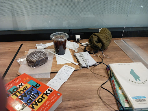 About 25 seats in a very convenient location next to the station. Sometimes a bit of bell noise when the door is open. Sort of modern artsy decorations. No Wi-Fi, but charging, which is why I picked it over the Doutor across the street. Rather awkwardly, the available Wi-Fi is the Doutor's signal, so I guess I have to give them a friendly review now.