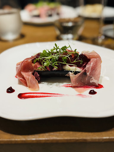3品目の前菜は ローストしたナスにビーツと生ハムのせ ヨーグルトソースを。