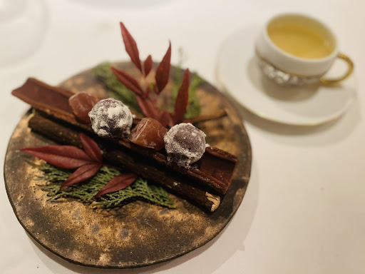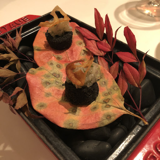 我們當晚的菜單如下: 《Amuse-Bouche・開胃小點》 ヤリイカのタルタル 柚子の香り お米のチップ/自家製カラスミ 槍烏賊生韃靼 柚子的香氣 脆米片/自家製烏魚子 《Pettit-Terrine・季節的小凍派》 地鶏胸肉と市田柿の小さなテリーヌ クレソンとせりのヨーグルトマヨネーズ 地雞胸肉和市田柿的小凍派 西洋菜和日本芹的優格美乃滋 《Terrine・凍派 八選一》➡我們兩人各選一種之後加點了一份,所以有三種。 仔うさぎと豚足のテリーヌ パセリ風味 根セロリのピュレ/青山椒のパウダー 幼兔和豬腳的凍派 巴西里風味 根芹菜泥/青山椒粉 7種類のキノコと帆立貝、栗の温かいテリーヌ セップ茸のエミュルション/トランペット茸のクーリ 七種菇類和扇貝、栗子的溫製凍派 牛肝菌的乳化醬汁/喇叭菌庫里 フランス産鴨フォアグラのテリーヌ ルバーブ/ヘーゼルナッツ/ブリオッシュ 法國產鴨肝凍派 大黃/榛果/布里歐修麵包 《Entrées chaudes・季節溫前菜》 フォアグラの温かいフラン ソースペリグー 溫製肥肝富籃 佩里格醬(Sauce Périgueux) 《Poisson du jour・魚料理》 サワラのポワレ 九条ネギと北海あさりのソース 早摘み伊予柑/焼き茄子 香煎土魠魚 九条蔥和北海蛤蜊的醬汁 早摘伊予柑/烤茄子 《Viande du jour・肉料理》 エゾシ鹿のロディ ソースポワブラード 赤キャベツとグロゼイユのブレゼ 煎烤蝦夷鹿 胡椒酸醋野味醬(Sauce Poivrade) 悶煮紫包心菜和紅醋栗 《Desserts・甜點》 紅玉とレーズンのテリーヌ パンデピスのグラス 紅玉蘋果和葡萄乾的凍派 香料麵包冰淇淋 《Café ou thé et...