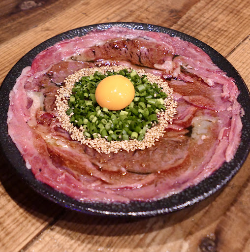 ■黒毛和牛の炙りユッケ 軽く炙った和牛は口の中でとろけます 味付けも程よく卵黄が絡んで最高です♡