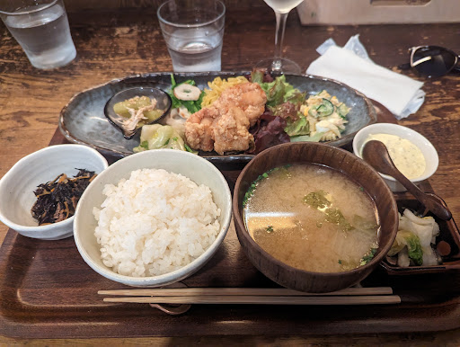 We had the fried chicken, Japanese style cold tofu, miso soup, rice and tsukemono. The food was delicious- the fried chicken was cooked so perfectly that my teenage daughter ordered an additional plate. What really made this little restaurant a five star review from me was the people. You walk in and you feel like you are a part of the community. They were gracious and warm. They carefully went over my daughters allergies and made sure their meal was safe for them. Also- it was very cute to observe the friendship that exists between the customers and the restaurant staff. There were a couple of children (ages 3 and 5) dining there that had just come from school, wearing their uniforms, that had recently moved so had not been to the restaurant in awhile. They were so excited to see the staff and vice versa! So far this unprententious spot is my favorite dining...