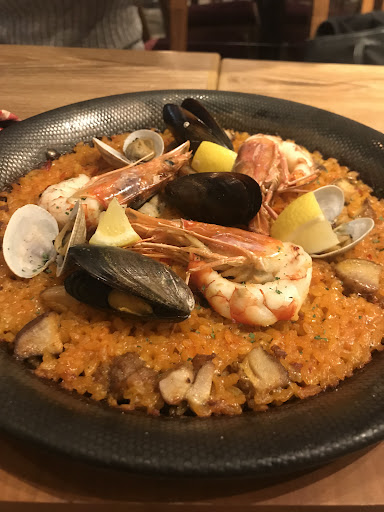 We (2 of us) came in for a drink and a bite at about 3:30 on a Sunday afternoon and not really intending to stay for long. The place was 1/4 full but we were told that we had to have a counter seat and couldn’t have a table seat. When we sat at the counter there were no knives or forks or wet towels so I had to go and get them myself from another unoccupied table. I can understand if a restaurant is full that they would want to optimize seating however this was not the case and the place was emptier when we left than when we entered. It would have been nice to have the space of a table. We didn’t order much but were disappointed all round. The table charge of almonds were overtly salty, the Iberico pork skewers were spongy and not well cooked at all and to be honest pretty disgusting, the squid ink paella was bland and unappetizing and had shards of mussel shell in it, however the liver mousse and the crab pinxtos were fine if uninspiring. They didn’t have red wine sangria and the white sangria came without fruit and tasted like juice. Small beers too. The staff were unresponsive robots. Will not come back. You can spend your cash...