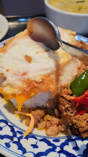 提供くなり早かった。 お皿にガパオライス、トレーには スープと 小さなタピオカとりんごが入っているデザートが。
