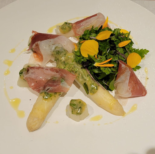 Stellar and amazing food and service. Had lunch today and it did all to impress. The restaurant is small as. Like a lovely French bistro in France. I enjoyed all my courses and we added a carafe of wine and bottled sparkling and still. Water here is a little expensive however for a restaurant average. We started with the white asparagus and the house deli platter. Both were delicious. The soup was an onion soup with crunchy croutons that were so delicious! A simple dish with a modern twist that worked well with the veal stock whirled into it for presentation and flavor. We upcharges for the lobster and ravioli and then ordered the duck. The dishes were magnificent and the presentation was unique. I never knew I was missing fish mousse ravioli until today! The dish was served with lobster tail which was very good. The duck was a perfect medium rare and the reinforced carrots and polenta were a wonderful compliment to the melt in your mouth texture and taste of the duck. The house cheese with herbs and garlic was an all around soft cheese which works for all even those who don’t love cheese. My husband did an add on of two cheeses so he could try the blue. He loved it for its taste and creaminess. Next we had dessert. We tried the house special dessert which was hot chocolate mousse and pistachio ice cream. Then the dessert which had meringue and fruit. All items were pleasing visually and taste. We so enjoyed our lunch and we didn’t hold back ordering exactly what we wanted to try. This was the perfect meal and we will bring friends here for sure. All dishes were worth the price except maybe the asparagus appetizer which was ¥2100 extra. Lobster was ¥3500 upcharge...