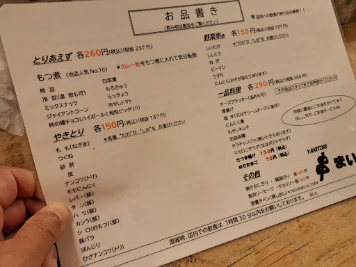 店の表で持ち帰りとしても販売している「焼き鳥」以外にも、グランドメニューには一品料理が色々と並んでいる。 定番のメニュー以外にも、ボード等に日替わりなのか、特別メニューも。