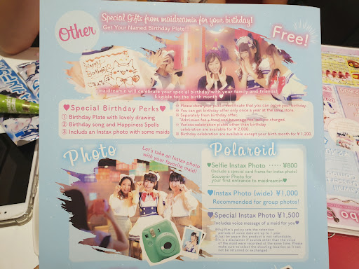 Waste of money and time. Came early afternoon just to try out a maid cafe. As I was walking towards this cafe, a girl on the street promoting maidreamin came up to us and handed out fliers. I told her I wanted to go, and she lead me to a "secret shop", as she said it would be a better experience. I go up there and the place was pretty small. We were seated and they give us a menu with packages. Everything on the package was almost 2500 yen or more. I came with my husband and we decided to order 1 dessert package with a drink and picture souvenir. Then they asked my husband what he wanted to order. Reluctant to order another package, I remembered that the flyer the girl gave me had some drinks on there, without having to order a package. So i took my flyer and we just ordered a 5000 yen juice. I think it's very tricky of them to give us a more expensive menu, rather than a full menu. Anyway, after taxes and fees, our whole bill came out to almost 4500 yen. I felt like I spent way too much money on this. We stayed for maybe 50 minutes cuz we were in a rush to go somewhere else. While we were there, we only saw 2 or 3 maids. Mostly only 1 was working on the floor. The other 2 were running in and out trying to hand out fliers or something. We had awkward conversations in english with the maid. She was nice enough. Dessert and drinks were alright. After we paid, they try to force you to give them a 5 star rating on google. They watch you give the review so I just pressed 5 stars just to get out of there. I just edited it with my real rating. Overall, I dont recommend this place. I'd rather have gone to the owl cafe twice than this scam. This is not a review on our maid, as she was nice, but the whole...