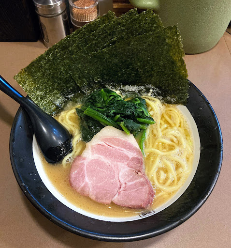 カウンターのみで13時ごろということもありすんなり着席。でもお客の出入りは結構あった。 前途のキーワードとは「らすた」と「百麺」。家系を勉強中に当店があって、ちょっと調べたら『「らすた」を生んだ「百麺」を運営する会社が出店』とあった。「らすた」は横浜・日吉にある人気の家系インスパイア店で、「百麺」は中目黒等にあるラーメン店。どちらも、もうずいぶん行ってないが何度か訪問したことがあり、美味しかった記憶がある。「百麺」で修業した人が「らすた」を開業したそうな。「らすた」は旨かったな~。ということで訪問した次第で、期待大というか間違いはないかなという感じ。 ラーメンは、「百麺」同様太麺と細麺が選べ、「百麺」のセオリーに従い太麺をチョイス。麺大盛無料は有り難く素直に従う。デフォだと海苔が1枚とちょっと寂しいが、海苔増しだと一気に6枚追加になるのとホウレン草の変わり込みで追加する。これで食物繊維は十分。 5分ちょっとで着丼。好みは全部普通。 麺は、老舗製麺所の家系用太麺だそうで、ぷりっとしてスープとの相性も良い。 スープは濃厚という感じではないが、動物系の旨味はしっかりあり、飲みやすい仕上がり。家系というよりは先日食べた「さつまっこ」の味に近いかな。あと「らすた」のような破壊力はないけど旨い。 大判のチャーシューだが、うんっなんだこりゃ、ハム?そう、どう味わってもハムなのだ。けして不味くはないのだが、ちょっと違和感。まぁ、豚を燻製したらハムなんだけどね。 7枚もある海苔を合間に挟むだが、思う存分楽しもうと思った海苔ご飯だけど、白飯が半ライスくらいの量で、ちょっとガックシ。 麺を食べ終わる直前に替え玉追加。替え玉は細麺のみなので、両方楽しむにはまずは太麺なのだ。ただ替え玉ということもあるのか細麺だとちょっとスープの絡みが弱い。 雑炊で〆てご馳走さまです。