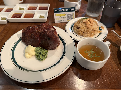 Pork steaks! Never seen this on a menu anywhere I’ve been before. Unique and not like steak. The service was great but we got seated on the third floor. There were a few tables up there but it felt like a storage closet with no windows. The second floor seems to be the nicest with large windows and lots of tables. The first floor is just counter seating where solo customers seem to be seated.
