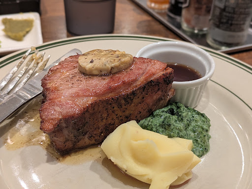 I ordered some add-ons: the lobster bisque, the truffle butter, and the garlic rice. The lobster bisque was fine, it had good flavor and it was smooth, but I think I would've been just as happy with miso soup or whatever they bring without charging extra. I just wanted hot liquid broth. The truffle butter was completely unnecessary. It had barely any truffle flavor. And they bring you a ramekin of au jus that's got all the extra flavor you need. Also, there was some wasabi and some other type of green spicy condiment; both were great. The garlic rice was outstanding, little chunks of garlic and pork, deep flavor--definitely a worthwhile upgrade from plain white rice.