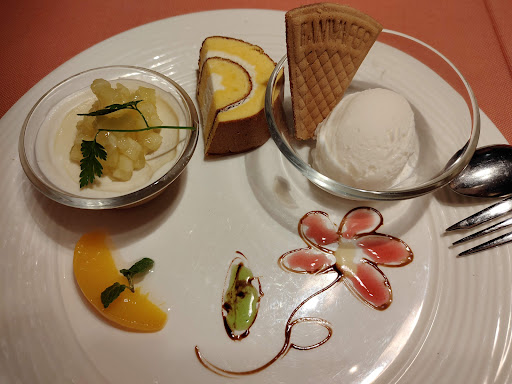 デザートのケーキは客席で切り分けて盛り付けてくれるが、そこは最初から切っておいてよいと感じた。時間がやたらかかるし、「あ、そんなに細いのね」とサイズにややがっかり感もあったから。三種のケーキを頼んだが、どれも美味しかった。