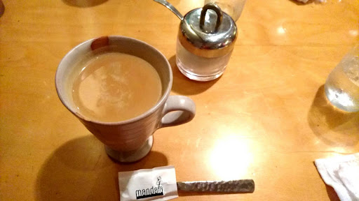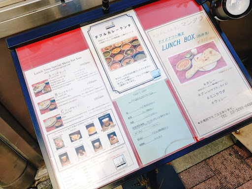 マンダラめがけて神保町へ。向かう途中にも他店の誘惑が…笑 ですが決意は固かったです。 口コミ通り、確かに見過ごしてしまいそう。看板左の階段で地下へ。 〇さすが、美味しんぼの表紙を飾ったこともある人気店!平日14時訪問で、半分ほどの賑わい。今までのインドカレー屋さんとの違いは20~30代女性が多いこと(驚き) コンクリート打ちっ放しの店内。色とりどりの布がお洒落です。雰囲気はさながら、代官山のおされカフェのよう。ジャズピアノが流れる店内は、インドカレー屋にいることを忘れてしまいそうです。 ※ただ、厨房に近い席で非常にバタバタとせわしなく、気になりました。あと厨房が丸見え。