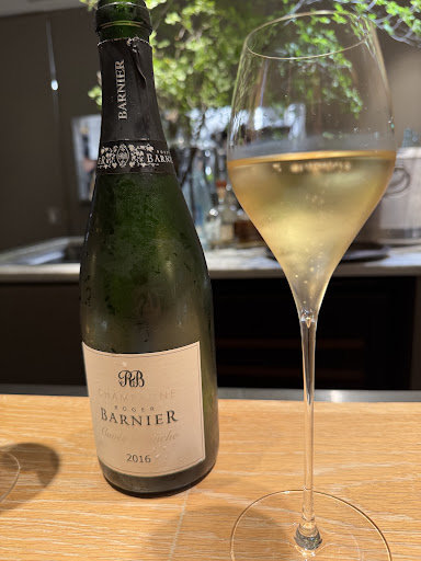 3杯のペアリングの最初の一杯、「ロジャー・バルニエ2016」で乾杯してスタート。…このシャンパン。元々お祖父さんはパリのシェフで故郷のヴィルヴナール村の小さな葡萄畑を買ったところからのスタート。大手メーカーに生産者として供給していた葡萄を3代目ロジェ・バルニエがワイン醸造所として独立。ストーリーも面白いが、9年経っているので泡立ちは少し穏やか。ただし香り良く、少し熟成感のある果実味とアロマが印象的。