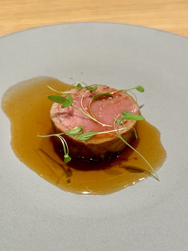《温前菜》…「槍島賊・ズッキーニ・ピスタチオ」… イカ飯のように槍島賊の中にパン粉とズッキーニを合わせたモノを詰め、魚介の出汁であるピルピルソース(スペインバスク地方の干しダラをじっくりオリーブオイルやニンニクで熱を加え、旨味とゼラチン質を取るソース。ピルピルという名前の由来はタラの煮える音らしい)で味付け。上には千切りしてパスタ仕立てにしたズッキーニのサラダ、ピスタチオの粒、フレッシュハーブ、あおさのパウダー。足し算した組み合わせ料理だが、見事な融合。めちゃ美味しい。イカ好きの自分としては満足度の高いひと皿。メイン料理ですと言われても頷いてしまいそうなくらい。…でも、まだ前菜(笑)
