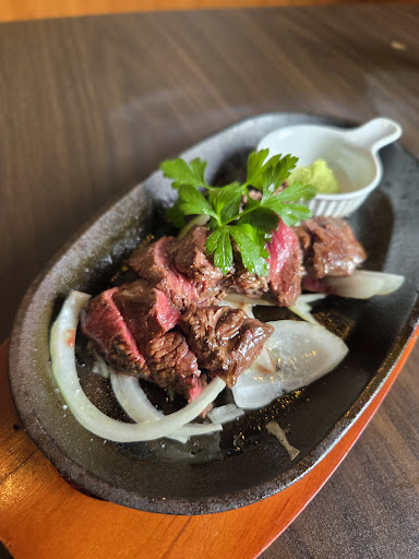 『ステーキ盛り合わせ』 名物のハラミ、牛ハツ、モモ肉の3種盛り合わせ🥩 モモ肉も柔らかく、コリコリ食感が新鮮でクセになるハツも美味しかったけど、やはりお気に入りはハラミ✨ 仕込みに丸2日かけたという名物のハラミは歯切れ良く柔らかで、噛むほどに旨味と香ばしさが広がる一番のお気に入りでした🤤 前半は塩とわさびで肉本来の旨味を、後半は和風ステーキソースで楽しめる満足の一皿でした!