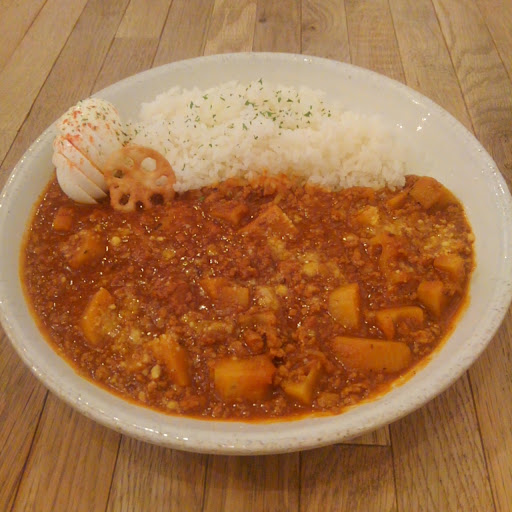 ランチメニューはラザニアかカレーの2種類のみのようで、レンコンと豚肉のカレーを頼みました。 ドリンクセットで1200円。 味は濃く甘くピリ辛とちょっと独特でしたが美味しかったです。薄味好きはルー少なめをお願いした方が良いかな。