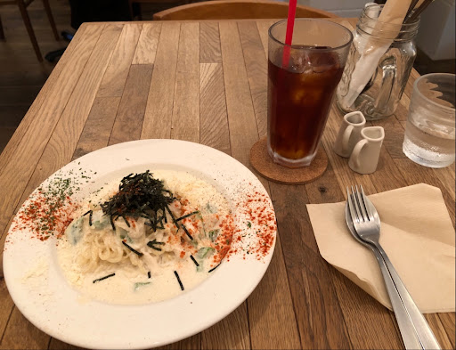 ささみとオクラのクリーム系の冷製パスタを頼みました。クリームソースにすりおろししょうがはいっていて(気のせいかたらこも入っていたような)夏向きの味付けで、全部のハーモニーがとても相性良く、意外な組み合わせに驚きましたが、とても美味しかったです♪