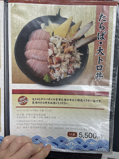 Ordered TARABA+OOTORO(大トロ Grand Fatty Tuna) DON for ¥5500 (about $35 USD) but got something totally different and the fish is red instead of pink which means it’s not grand fatty tuna at all (the pinker the more fat) and it’s totally not chewable (see pictures). What we got was just some bad quality tuna, not OOTORO at all… BTW they were even not flat pieces but folded pieces that cut from some corners…