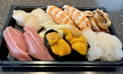 The menu includes à la carte sushi, special nigiri sets, omakase (chef’s choice) sets, and a few rice bowl options. For takeout, I ordered two pieces each of scallop, prawn, fatty tuna, sea urchin, and white shrimp nigiri, as well as one piece of simmered clam nigiri.
