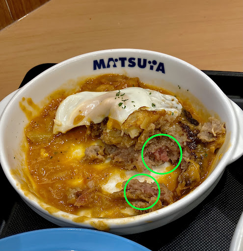 Read more2025/02/26追記 「煮込みキャベツのエッグトマトハンバーグ定食」を頼んだところ、 生焼けでピンク色状態のハンバーグを提供されました。(添付画像参照。食いさしの汚い画像で申し訳ありません) 途中まで気づかずに食べてしまいました。生肉独特の物凄い味がしました。 仕方なくハンバーグは半分ほど残して退店しようとお膳下げに行ったら、返却棚にはおぼんがギッチリ。特に忙しそうという雰囲気も無くバックルームでは外人の女の子店員が2人でおしゃべり中。 下記のニオイの点もそうですが、本当に残念な店舗になり下がりましたね。(冬場だったからか今日は店内に便所臭はしませんでした)。 ニオイは季節で回避出来そうですが、生焼けハンバーグまで出されてしまうと健康を害してしまいそうで流石に行く気を無くしてしまいました。