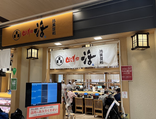 Seems to be a very popular kaiten (moving-track) sushi place with about 30 seats around the main counter and some booths. The booths might be okay for lunchtime conversation, but it looks like they're hard to get. There's a computerized seat reservation system by the door, though I don't really understand the purpose. You can see who's waiting ahead of you in the chairs, and there's no way to make a reservation for later. Also, I couldn't see any way to reserve one of those booths.