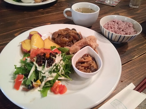 The Vegetable Plate is the only vegan option, and comes with soup and rice. The portion size was small, but it was delicious. I really liked the complimentary corn tea, too, which is available to buy in their little shop corner beside the cashier.