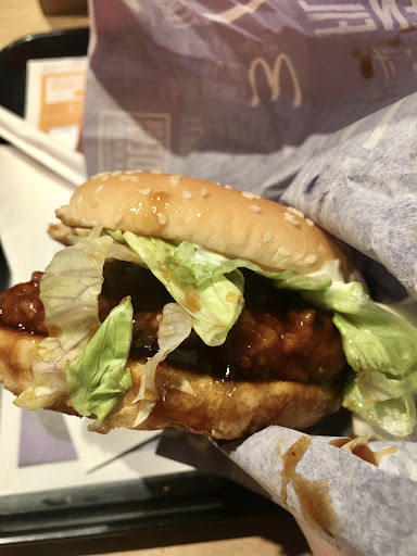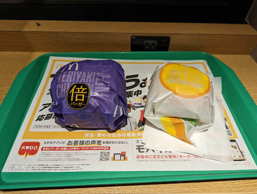 Teriyaki chicken sandwich was pretty much the normal McChicken in america, even with the mayo, and then with teriyaki sauce added. Def an interesting taste. They also had shrimp burger, and a few other japan specialty items. The soda cups are like 3/5 of american equivalents, so keep that in mind when you order extra food on the side. Also pay attention to paper/plastics when you throw stuff...