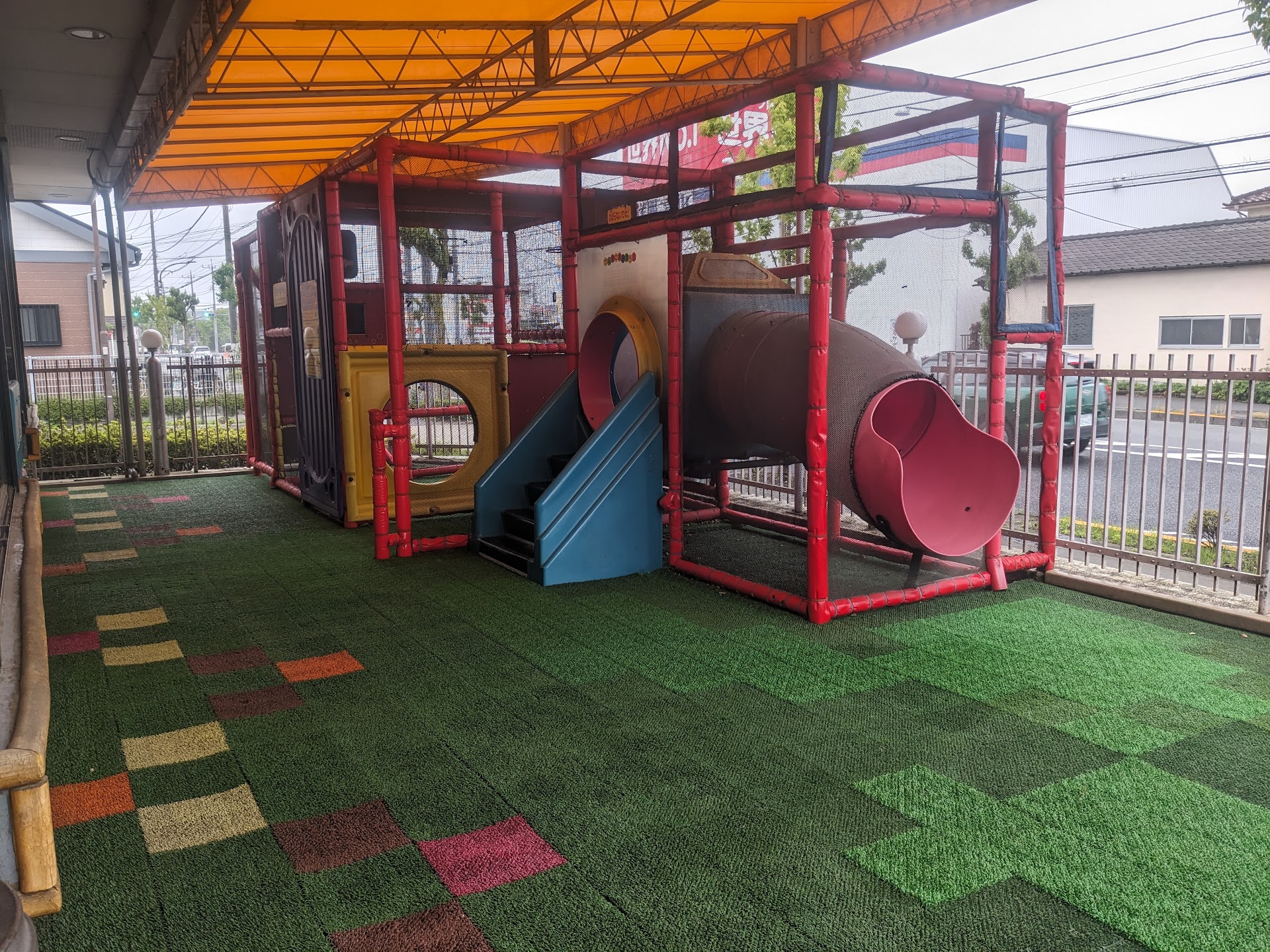 Read more2025年5月の時点では店内にキャッシュレス注文端末はありませんでした。モバイルオーダー等以外では店頭カウンターでの対面注文になるため混雑時には少し待ち時間を考慮した方が良いかもしれません。 平屋建ての店舗に、4人掛けのテーブルと2人掛けのテーブルがそれぞれ10ほどと5〜6人ほどが座れる長テーブル席が2つありますが、混雑時には満席になってしまいます。 ここには子供向けのプレイランドがあります。かつては電動式の仕掛けがあったようですが、故障したのかいまは電源が入っていません。それでも子どもたちは満足して遊んでいます。床面の人工芝のモザイク柄も、子どもたちにとっては十分な遊具になっています。遊具の上にはテント生地の屋根がありますが隣接した屋外テーブル席には屋根がありません。雨...